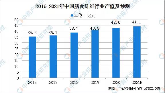 2016年,我國(guó)膳食纖維行業(yè)總產(chǎn)值約35.2億元,2020年上升至42.6億元。預(yù)計(jì)到2021年,我國(guó)膳食纖維行業(yè)總產(chǎn)值將達(dá)到44.1億元。