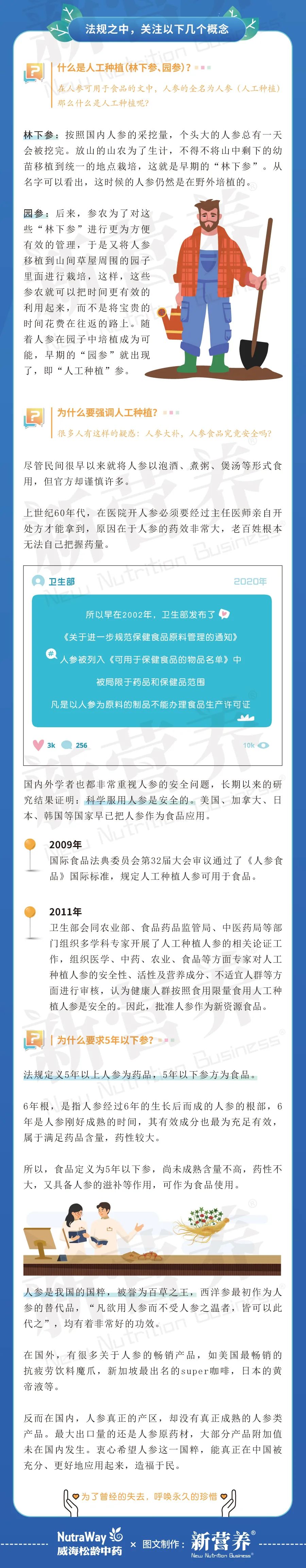 2011年,衛(wèi)生部會同農(nóng)業(yè)部、食品藥品監(jiān)管局、中醫(yī)藥局等部門組織多學(xué)科專家開展了人工種植人參的相關(guān)論證工作,組織醫(yī)學(xué)、中藥、農(nóng)業(yè)、食品等方面專家對人工種植人參的安全性、活性及營養(yǎng)成分、不適宜人群等方面進行審核,認(rèn)為健康人群按照食用限量食用人工種植人參是安全的。因此,批準(zhǔn)人參作為新資源食品。