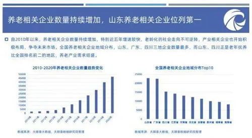 報(bào)告顯示,山東、廣東、四川、江蘇、河南、河北、安徽、貴州、湖南、海南,位居全國養(yǎng)老相關(guān)企業(yè)數(shù)量Top10。養(yǎng)老院企業(yè)數(shù)量,北京、河南、江蘇為全國前三。山東養(yǎng)老企業(yè)數(shù)量全國第一;廣東養(yǎng)老企業(yè)數(shù)量全國第二,養(yǎng)老院數(shù)量位居全國第五;四川與河南在這兩大維度數(shù)量上也都有優(yōu)勢。2020老年撫養(yǎng)比位居第四的江蘇,養(yǎng)老企業(yè)和養(yǎng)老院企業(yè)數(shù)量,則分別為全國第四、第三。