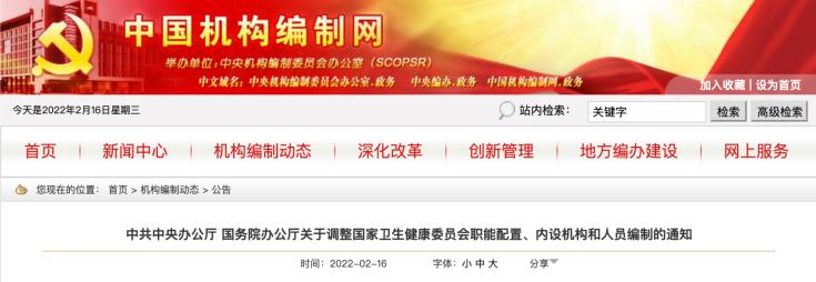 根據(jù)《中國(guó)共產(chǎn)黨機(jī)構(gòu)編制工作條例》和黨中央關(guān)于疾病預(yù)防控制工作的決策部署,經(jīng)報(bào)黨中央、國(guó)務(wù)院批準(zhǔn),現(xiàn)將國(guó)家衛(wèi)生健康委員會(huì)職能配置、內(nèi)設(shè)機(jī)構(gòu)和人員編制調(diào)整事項(xiàng)通知如下。