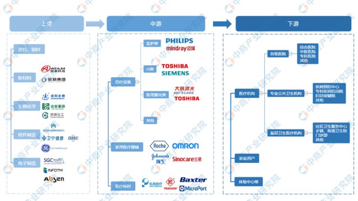 在醫(yī)療器械的產(chǎn)業(yè)鏈中,上游為零部件供應(yīng)和生產(chǎn),中游為醫(yī)療器械的組裝和合成,下游為各級(jí)市場(chǎng)的零售服務(wù)。