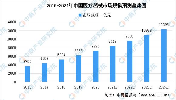 在中國(guó),隨著居民生活水平的提高和醫(yī)療保健意識(shí)的增強(qiáng),醫(yī)療器械產(chǎn)品需求持續(xù)增長(zhǎng)。受國(guó)家醫(yī)療器械行業(yè)支持性政策的影響,國(guó)內(nèi)醫(yī)療器械行業(yè)整體步入高速增長(zhǎng)階段。2016年到2019年,中國(guó)醫(yī)療器械市場(chǎng)規(guī)模從3700億元增長(zhǎng)至6235億元,期間年復(fù)合增長(zhǎng)率為19.3%,其增速遠(yuǎn)超全球醫(yī)療器械市場(chǎng)同期增速,并將繼續(xù)保持快速增長(zhǎng),到2024年預(yù)計(jì)將達(dá)到12295億元。