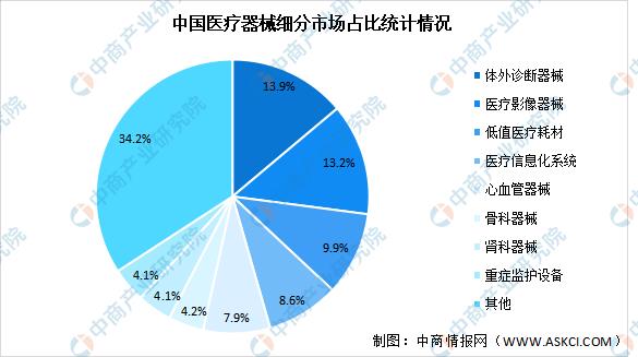 中國(guó)醫(yī)療器械細(xì)分領(lǐng)域中,體外診斷器械、醫(yī)療影像設(shè)備、低值醫(yī)療耗材為醫(yī)療器械細(xì)分領(lǐng)域的前三大板塊,在整體醫(yī)療器械市場(chǎng)的占比分別為13.9%、13.2%、9.9%。其中我國(guó)醫(yī)療影像設(shè)備市場(chǎng)規(guī)模在2019年達(dá)到824億元。