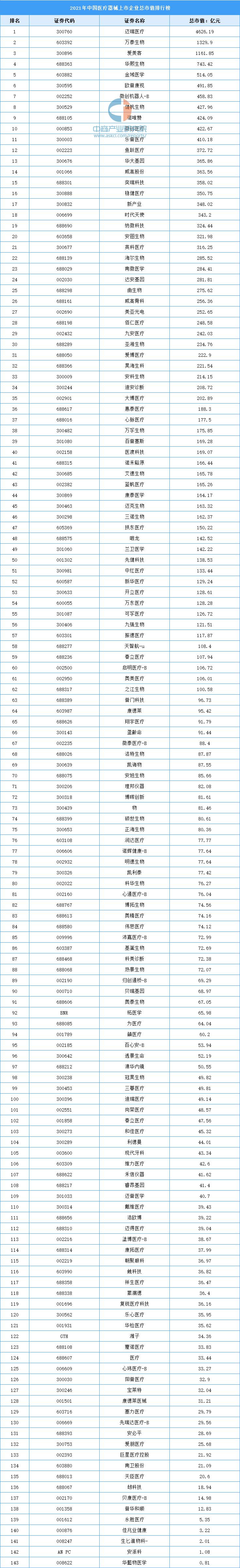 下圖為我國(guó)醫(yī)療器械上市企業(yè)市值排行榜(總市值截至到2021年12.31日):