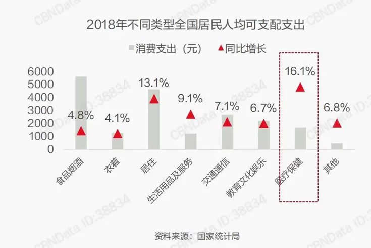 伴隨著中國經(jīng)濟(jì)的快速增長,人民生活水平不斷提升,“健康”在人們心中變得越來越重要,重視程度達(dá)9.6分。2018年全國居民人均各項(xiàng)消費(fèi)支出中,醫(yī)療保健支出同比增速最高。
