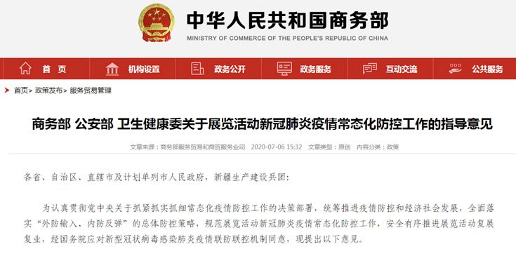 2020年7月3日,三部委(商務(wù)部、公安部、衛(wèi)健委)對(duì)疫情下的展覽活動(dòng)提出詳細(xì)的指導(dǎo)意見,7月6日在商務(wù)部網(wǎng)站公布,這可謂一石激起千層浪,為會(huì)展產(chǎn)業(yè)的全面復(fù)蘇帶來了真正福音。確切地說,這可以理解為2020年會(huì)展業(yè)真正復(fù)蘇的開端,意味著相應(yīng)的一些審批程序?qū)⒃趯徤鞯姆諊谐掷m(xù)往前,這也意味著會(huì)展業(yè)前期的一些積極準(zhǔn)備將進(jìn)入開拔階段。