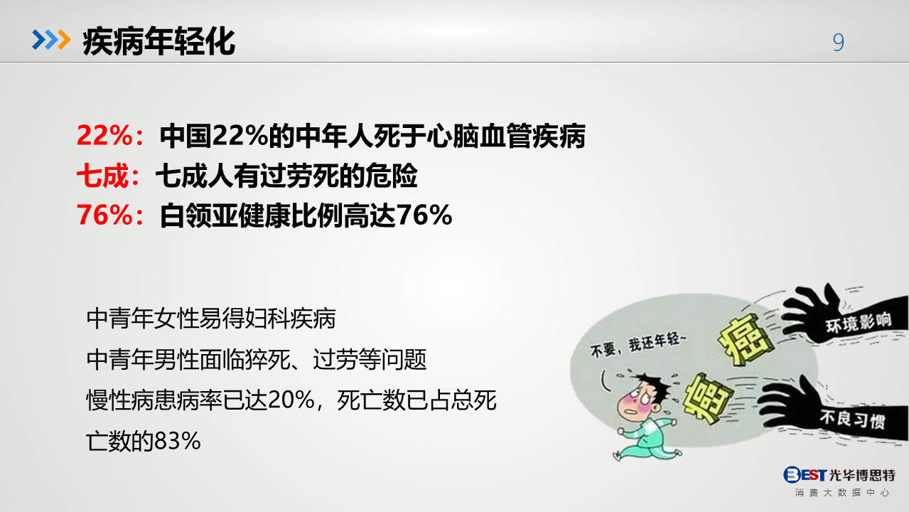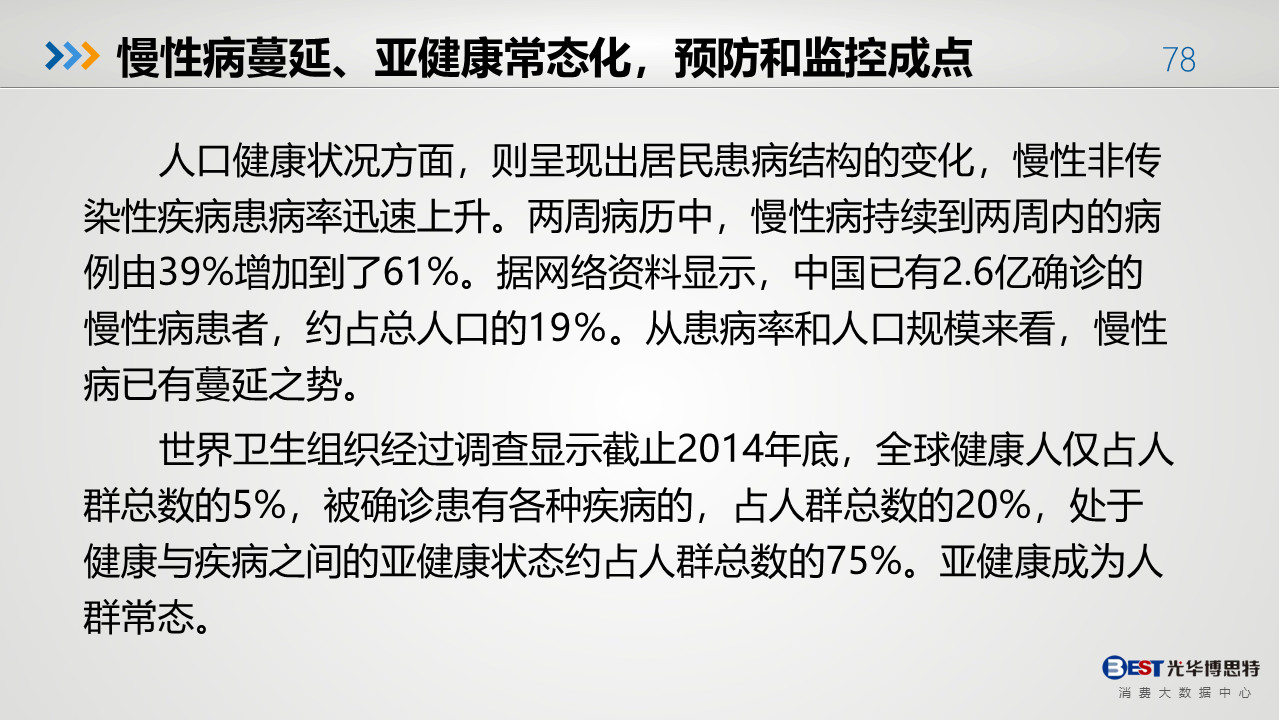 雖然國(guó)民健康問(wèn)題嚴(yán)峻,但隨著消費(fèi)升級(jí)、健康意識(shí)的提高利好大健康行業(yè)各領(lǐng)域的發(fā)展,先后經(jīng)歷 “基本消費(fèi)”向“高層消費(fèi)”的轉(zhuǎn)變。創(chuàng)新是引領(lǐng)發(fā)展的第一動(dòng)力,創(chuàng)新更是大健康行業(yè)持續(xù)發(fā)展的生命源泉。在疫情影響下的2020,大健康行業(yè)更應(yīng)抓住此次機(jī)會(huì),充分理解健康理念,為消費(fèi)者帶來(lái)更好的體驗(yàn)。