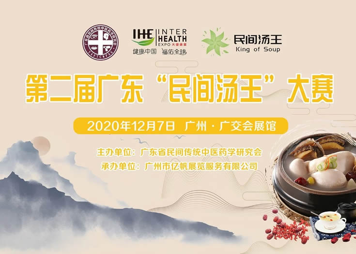 2020年12月6-8日,第29屆廣州國際大健康產(chǎn)業(yè)博覽會(IHE China 2020),將于廣州·廣交會展館舉辦。屆時,作為IHE China廣州國際大健康產(chǎn)業(yè)博覽會同期活動,第二屆廣東“民間湯王”大賽也將在12月7日拉開帷幕。