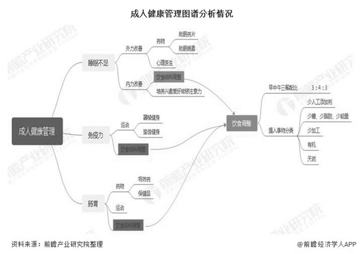 根據(jù)世界衛(wèi)生組織的數(shù)據(jù)顯示,在中國已經(jīng)約有9億人呈現(xiàn)亞健康的狀態(tài),由此可見健康管理擁有巨大的潛在市場。從健康管理的角度來看,成人最注重健康食品的攝取。