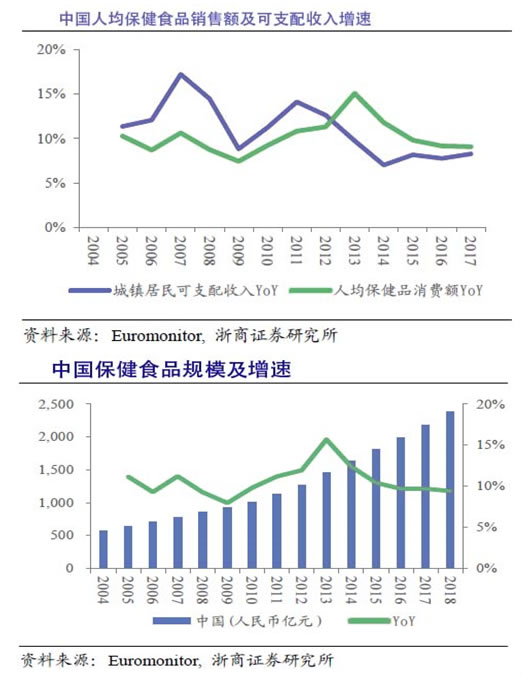 歷史研究資料顯示,當一國人均GDP從4000美元向8000美元躍升階段中,消費者在保健食品消費驅動上會從可選消費品向必選消費品轉變,進而帶動保健食品行業(yè)需求的提升。2015年我國人均GDP跨入5萬元的關口,保健食品人均消費額增速的走勢亦和可支配收入增速趨于一致。