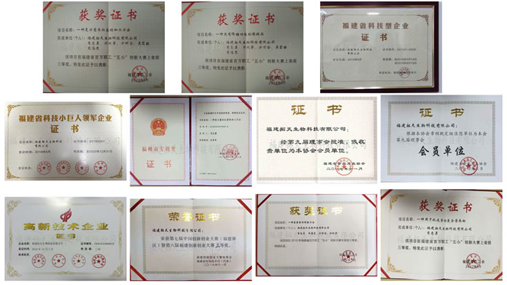福建拓天生物科技有限公司先后被認(rèn)定為國(guó)家高新技術(shù)企業(yè)、福建省科技型企業(yè)、福建省科技小巨人領(lǐng)軍企業(yè)、福建省知識(shí)產(chǎn)權(quán)優(yōu)勢(shì)企業(yè)、福州市知識(shí)產(chǎn)權(quán)示范企業(yè)、福州市守合同重信用企業(yè)。2018年建立了中國(guó)生物工程學(xué)會(huì)創(chuàng)新驅(qū)動(dòng)服務(wù)站,同時(shí)參加中國(guó)創(chuàng)新創(chuàng)業(yè)大賽榮獲福建省創(chuàng)新創(chuàng)業(yè)大賽三等獎(jiǎng)、并入圍中國(guó)創(chuàng)新創(chuàng)業(yè)大賽總決賽,也是福建省食品工業(yè)協(xié)會(huì)會(huì)員單位。公司2016年、2017年、2018年連續(xù)被授予福州市工人先鋒號(hào)、福州市先進(jìn)職工之家榮譽(yù)稱(chēng)號(hào),并獲得福建省百萬(wàn)職工創(chuàng)新大賽三等獎(jiǎng)四項(xiàng)、福州市專(zhuān)利獎(jiǎng)一項(xiàng)。公司申請(qǐng)國(guó)家發(fā)明專(zhuān)利30項(xiàng)、實(shí)用新型專(zhuān)利9項(xiàng),其中已授權(quán)國(guó)家發(fā)明專(zhuān)利6項(xiàng)、實(shí)用新型專(zhuān)利5項(xiàng);注冊(cè)“拓天人”、“帥寶”、“帥麗寶”商標(biāo)5件;2018年通過(guò)知識(shí)產(chǎn)權(quán)管理體系認(rèn)證。