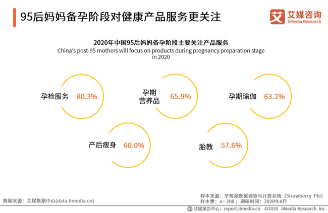 iiMedia Research(艾媒咨詢)數(shù)據(jù)顯示,受訪的95后媽媽在備孕階段,關(guān)注較多的前五項(xiàng)產(chǎn)品主要集中在健康產(chǎn)品服務(wù)領(lǐng)域,以產(chǎn)檢、唐篩等為代表的孕檢服務(wù)排在首位,占比達(dá)80.3%,其次是孕期營(yíng)養(yǎng)品,占比為65.9%;孕期瑜伽占63.2%。艾媒咨詢分析師認(rèn)為,隨著社會(huì)發(fā)展和進(jìn)步,國(guó)民健康意識(shí)的整體水平不斷提升,新生代媽媽群體不僅關(guān)注寶寶健康,更多的展示了對(duì)自我健康的關(guān)注。
