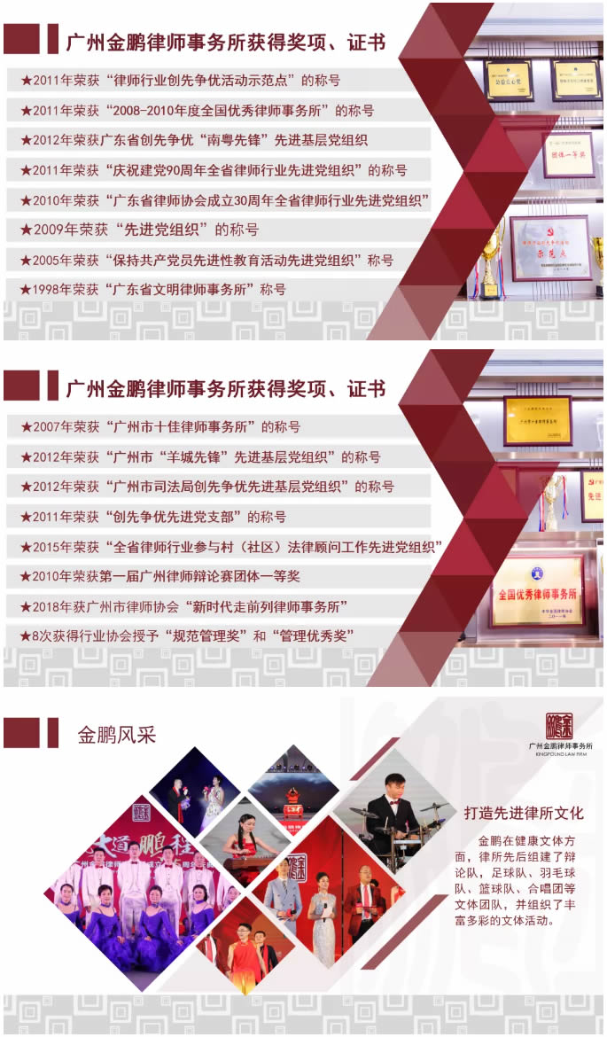 廣州金鵬律師事務(wù)所成立于1993年1月,是廣州第一家市屬合伙制律師事務(wù)所。1997年,經(jīng)司法部批準(zhǔn),金鵬成為最早在美國洛杉磯設(shè)立辦事處的中國律師事務(wù)所。2006年,金鵬購置了珠江新城寫字樓,成為廣州市首家進(jìn)駐中央商務(wù)區(qū)CBD的綜合大型律師事務(wù)所。2015年,金鵬成功獲批改制成為廣東省首批特殊普通合伙制律師事務(wù)所之一,為今后的大格局發(fā)展打下了堅(jiān)實(shí)的基礎(chǔ)。經(jīng)過穩(wěn)健發(fā)展,金鵬已發(fā)展成為廣東地區(qū)最具規(guī)模的大型律師事務(wù)所之一,在全國法律界具有重要影響力。
