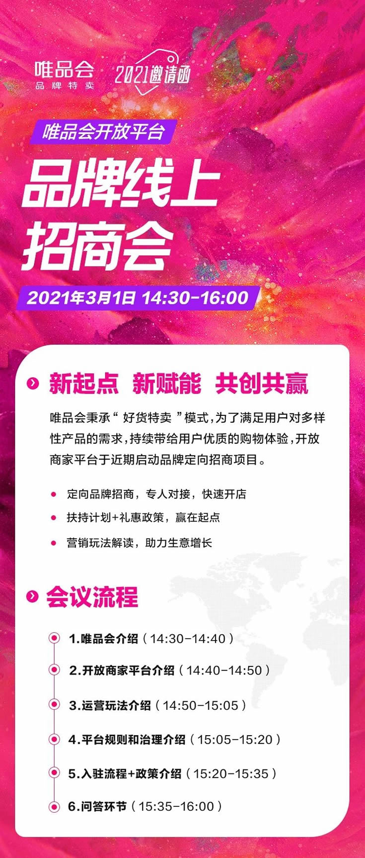 為滿足用戶多樣性產(chǎn)品的需求,唯品會MP開放商家平臺于近期啟動品牌定向招商項目,將于2021年3月1日舉辦線上招商會。