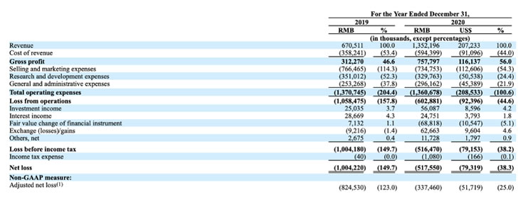 那么,這樣一家稀缺的互聯(lián)網(wǎng)公司,要如何撐起一個IPO?招股書顯示,知乎2020年總營收為13.52億,相比2019年營收6.71億,同比增長101.7%;全年毛利為7.58億,同比增長142.7%;全年毛利率為56%,同比增長20.2%。