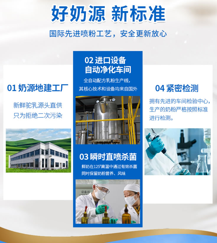 全脂乳粉選用新疆伊列克大草原生鮮駝乳為原料,采用先進工藝技術(shù)生產(chǎn)而成。產(chǎn)品保留了生鮮駱駝乳中特有的活性物質(zhì)。