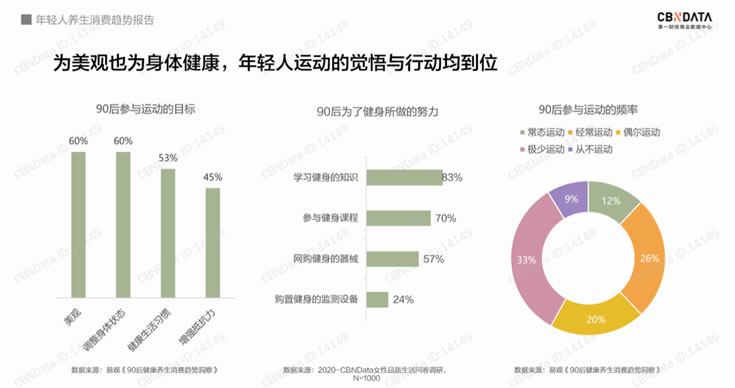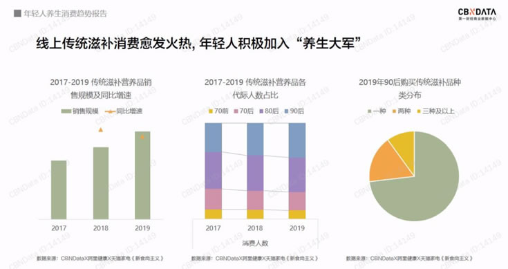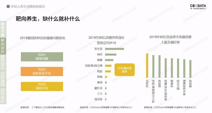 加上受今年疫情影響,年輕人養(yǎng)生意識(shí)空前上漲,消費(fèi)者的健康理念和消費(fèi)理念全面升級(jí),年輕人不再只是注重美食、服飾、電子、娛樂(lè)等方面,而是更多地關(guān)注與健康、養(yǎng)生強(qiáng)相關(guān)的產(chǎn)品。根據(jù)報(bào)告,目前九成以上90后已有養(yǎng)生意識(shí),超半數(shù)90后已經(jīng)走在養(yǎng)生的路上。