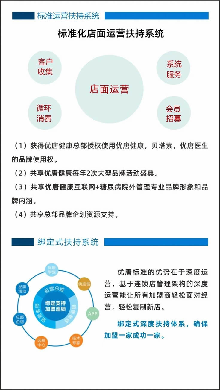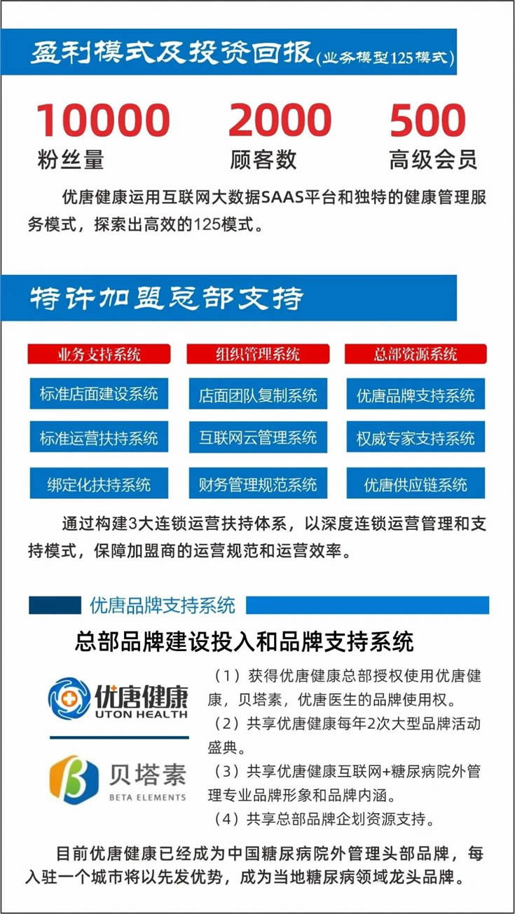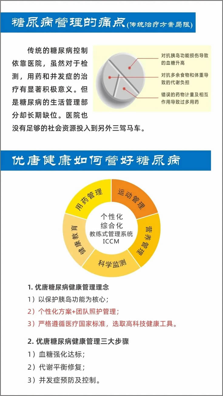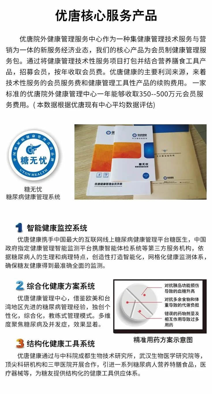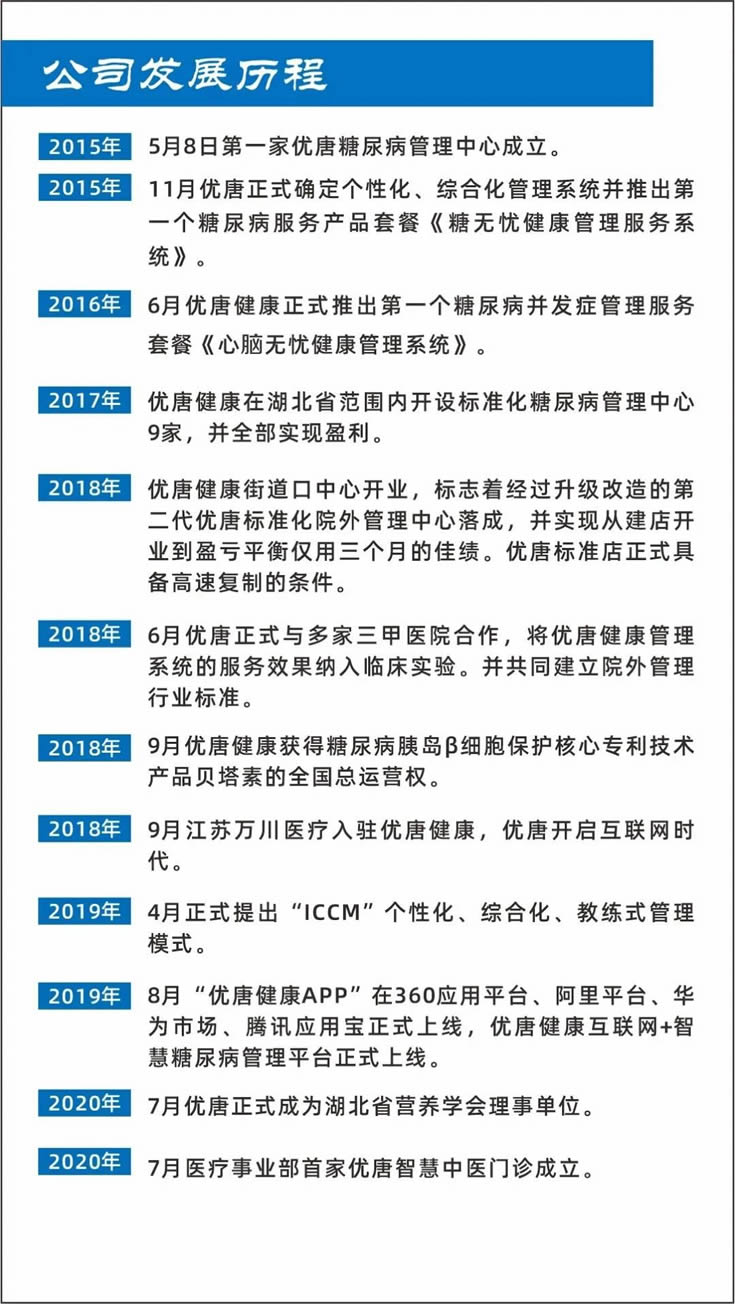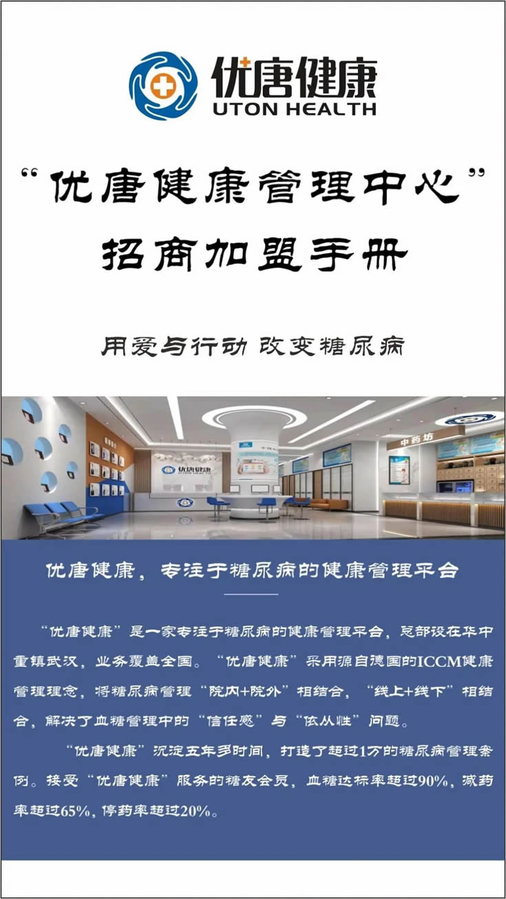 湖北優(yōu)唐健康管理有限責任公司是由湖北省知名醫(yī)藥連鎖集團健康人醫(yī)藥集團、江蘇萬川醫(yī)藥集團等多家集團公司戰(zhàn)略投資控股的國內(nèi)第一家綜合型糖尿病健康管理專業(yè)機構,公司專注于通過領先的健康管理科技、工具和服務,建立完整的糖尿病系統(tǒng)解決方案,經(jīng)過高速發(fā)展,優(yōu)唐健康已經(jīng)發(fā)展成為集健康管理服務、健康管理技術輸出、健康工具銷售、健康管理中心連鎖加盟為一體的糖尿病健康管理服務平臺。