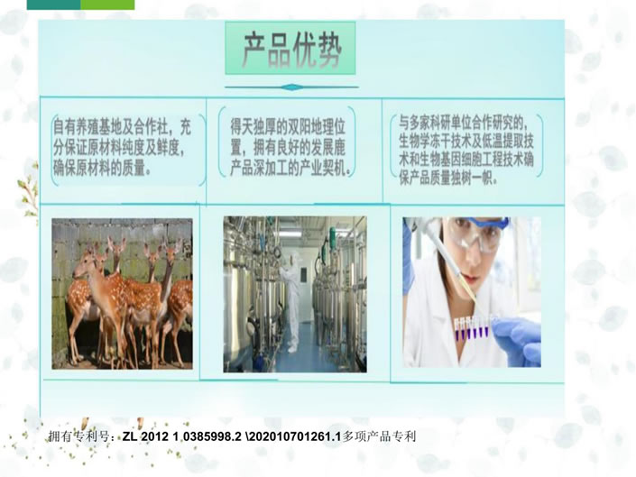 原料采用中國(guó)梅花鹿之鄉(xiāng)——吉林雙陽(yáng)的優(yōu)質(zhì)鹿茸血,自營(yíng)鹿場(chǎng),從源頭把控產(chǎn)品質(zhì)量。無(wú)添加更安全,獨(dú)立包裝,食用方便。