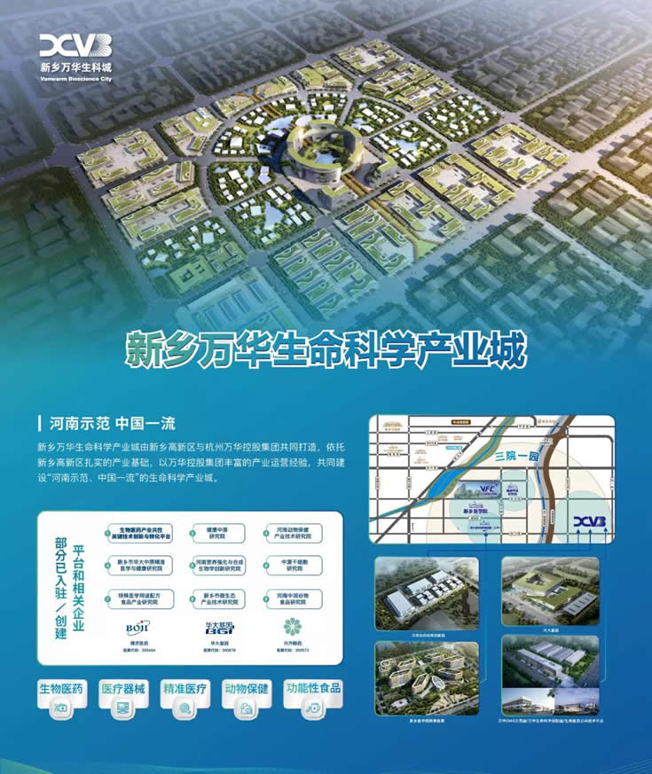 新鄉(xiāng)萬華生命科學(xué)產(chǎn)業(yè)城,由杭州萬華控股集團(tuán)與新鄉(xiāng)高新投資發(fā)展有限公司合資建設(shè)。規(guī)劃占地2880畝,總投資110億元,以生物醫(yī)藥、醫(yī)療器械和高端耗材、精準(zhǔn)診療、動(dòng)物保健和功能性食品為五大主導(dǎo)產(chǎn)業(yè)。