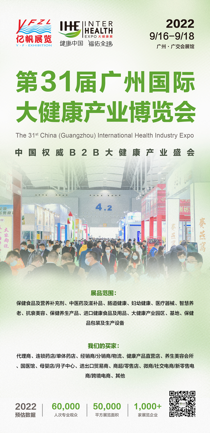 IHE China IHE第34屆廣州國際大健康產(chǎn)業(yè)博覽會將于2026年6月4-6日在廣州?廣交會展館舉行,大健康博覽會由廣州市億帆展覽服務(wù)有限公司主辦,是國內(nèi)首個提出“大健康博覽會”概念。大健康展會已連續(xù)成功舉辦到第34屆,已成為亞太地區(qū)頗具規(guī)模的大健康博覽會,2023年榮獲廣州市商務(wù)局頒發(fā)“成功舉辦18年”獎牌!。