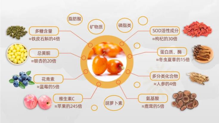 沙棘是一種含有多種維生素、多種微量元素、多種氨基酸和其它生物活性物質的藥用食物(藥食同源)。同時,能在沙漠和高寒山區(qū)的惡劣環(huán)境中生存的植物,地球上生存超過兩億年的古老植物。其果實中含有維生素、黃酮類及多酚類、不飽和脂肪酸、植物甾醇類及植物固醇、微量元素等428種生物活性成分,被稱為“生物活性物質寶庫”。