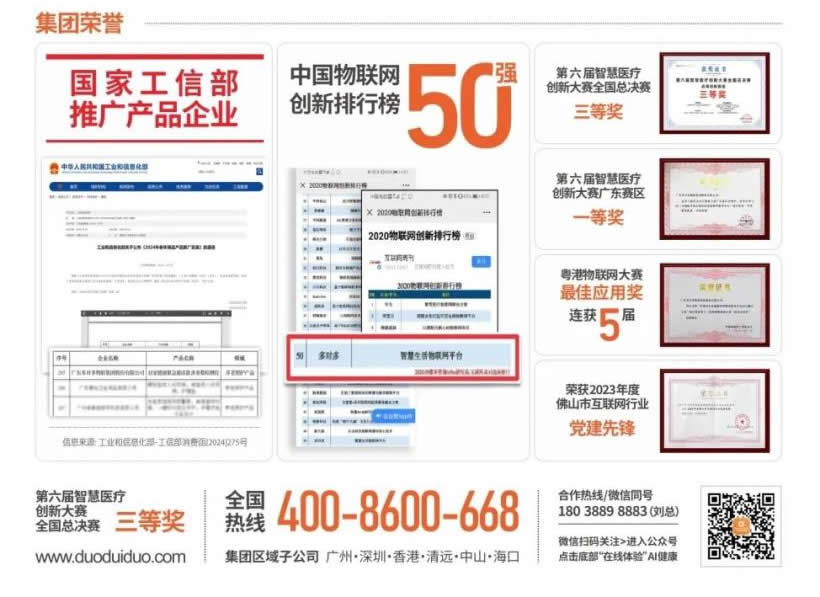 多對(duì)多物聯(lián)集團(tuán)在華為多年的戰(zhàn)略支持下,以物聯(lián)網(wǎng)(IoT)技術(shù)為基礎(chǔ),人工智能(AI)分析與決策為中樞,并以多維度、連續(xù)性、動(dòng)態(tài)化健康數(shù)據(jù)為核心驅(qū)動(dòng)力構(gòu)建的AI健康管理服務(wù)系統(tǒng),深度融合DeepSeek算法推理大模型,完成了數(shù)智驅(qū)動(dòng)的精準(zhǔn)健康流量閉環(huán),引領(lǐng)健康管理領(lǐng)域AI應(yīng)用優(yōu)勢(shì)。榮獲第六屆廣東省智慧醫(yī)療大賽一等獎(jiǎng)、第六屆全國(guó)智慧醫(yī)療大賽三等獎(jiǎng)、第十三屆粵港物聯(lián)網(wǎng)大賽最佳應(yīng)用獎(jiǎng)和2024日內(nèi)瓦國(guó)際發(fā)明亞洲銀獎(jiǎng)。
