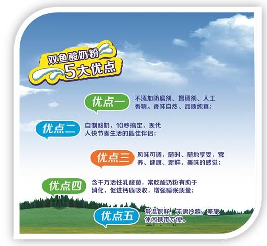 雙魚酸奶粉品味獨(dú)特,酸甜可口,長期食用酸奶粉,可促進(jìn)腸胃消化排毒,有益鈣質(zhì)吸收,增強(qiáng)睡眠質(zhì)量,同時具有即沖即飲、無需發(fā)酵、風(fēng)味可調(diào)、常溫保鮮、攜帶方便等諸多優(yōu)點(diǎn)。
