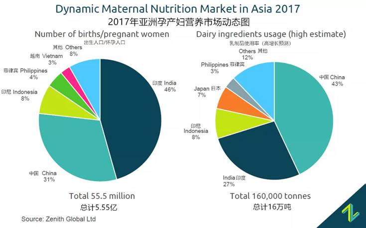 Zenith Global在其2019年發(fā)布的《亞洲孕產(chǎn)婦營養(yǎng)市場動態(tài)報告》中指出,到2023年該地區(qū)的乳制品成分有可能多達(dá)47.5萬噸,包括日常的奶粉,以及使用乳蛋白和乳脂的高價值特色產(chǎn)品。