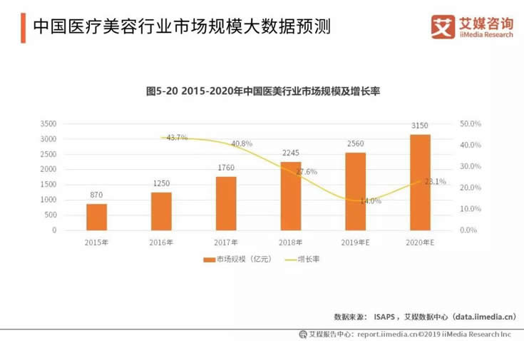 中國(guó)醫(yī)療美容市場(chǎng)2018年規(guī)模達(dá)2245億元,2012-2015年中國(guó)醫(yī)療美容市場(chǎng)的復(fù)合增長(zhǎng)率為22.7%,預(yù)測(cè)2020年將達(dá)3150億元。艾媒咨詢分析師認(rèn)為,中國(guó)醫(yī)療美容行業(yè)有比較大的增長(zhǎng)潛力,特別是如新氧等公司IPO上市成功,會(huì)進(jìn)一步提高醫(yī)美行業(yè)的資本關(guān)注度。