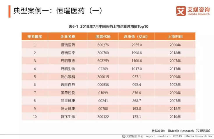 截至2019年7月30日,中國(guó)醫(yī)藥上市企業(yè)市值排行榜中,恒瑞醫(yī)藥穩(wěn)居第一,總市值將近3000億元人民幣。艾媒咨詢分析師認(rèn)為,隨著中國(guó)對(duì)自主研發(fā)科技的關(guān)注度提高,依托技術(shù)的醫(yī)藥企業(yè)的價(jià)值獲得資本市場(chǎng)的高度認(rèn)可;特別是科創(chuàng)板的推行,未來(lái)幾年將進(jìn)一步利好醫(yī)藥企業(yè)上市。