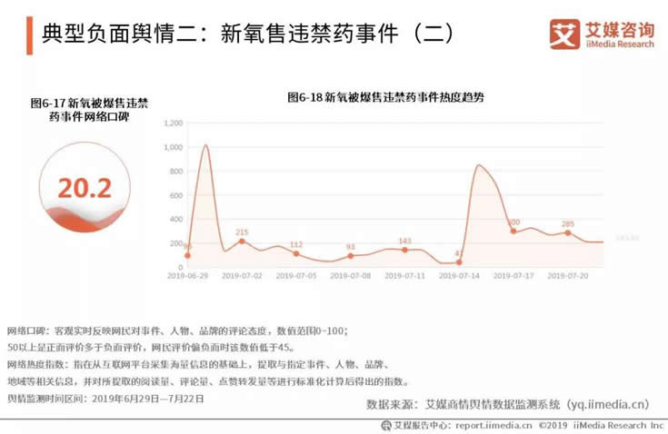 據(jù)艾媒商情輿情數(shù)據(jù)監(jiān)測(cè)系統(tǒng)顯示,在2019年6月30日,有消費(fèi)者投訴新氧推薦違規(guī)醫(yī)美機(jī)構(gòu)致整容失敗,#新氧App黑心推薦致妙齡女子毀容#話題登上微博熱搜,引起了網(wǎng)民的高度關(guān)注,輿論熱度達(dá)到頂峰。到7月15日,新京報(bào)發(fā)布報(bào)道《新氧APP商家涉售違禁藥,“變美日記”可造假》,新氧輿論熱度迅速上升,再次陷入管控失格輿論風(fēng)波。網(wǎng)絡(luò)口碑值為20.2,表明網(wǎng)民對(duì)事件抱有較強(qiáng)的負(fù)面態(tài)度。