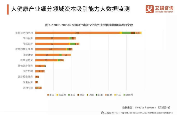 2018-2019年大健康產(chǎn)業(yè)的境外投資中,美國(guó)在各領(lǐng)域都占最大的比重。