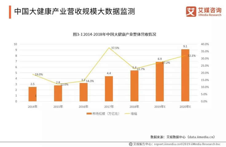 2014年到2018年,中國(guó)的大健康產(chǎn)業(yè)整體營(yíng)收保持增長(zhǎng),2018年?duì)I收規(guī)模超過(guò)5萬(wàn)億元,預(yù)計(jì)2020年將超過(guò)9萬(wàn)億元,增幅達(dá)32.1%。艾媒咨詢分析師認(rèn)為,中國(guó)與全球的大健康產(chǎn)業(yè)發(fā)展情況基本一致,同樣由于社會(huì)結(jié)構(gòu)變化而需求不斷增長(zhǎng),具有可持續(xù)增長(zhǎng)性。