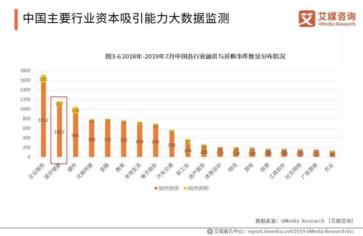 2018-2019年中國(guó)醫(yī)療健康領(lǐng)域的融資與并購(gòu)事件數(shù)量居于第二位,超過(guò)一千件。而企業(yè)服務(wù)、硬件領(lǐng)域的項(xiàng)目融資與并購(gòu)事件數(shù)則分別位于第一、第三位??梢?018-2019年中國(guó)大健康產(chǎn)業(yè)的融資熱度處于較高水平。