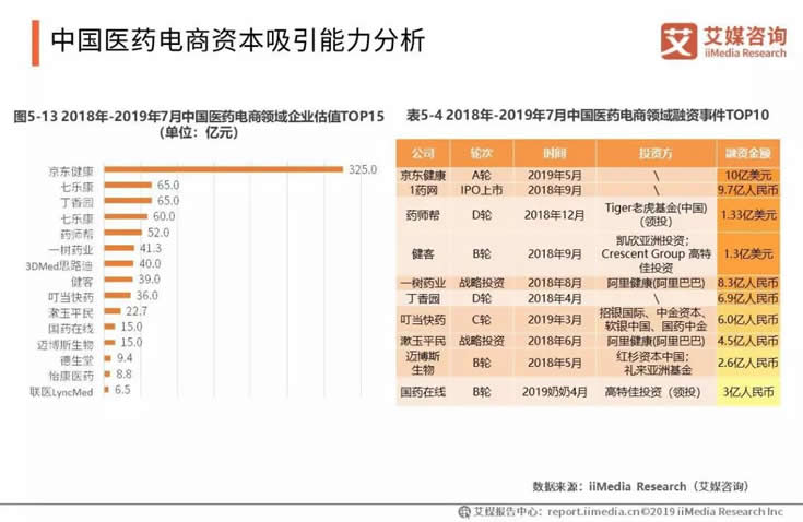 2018年-2019年7月醫(yī)藥電商最新融資事件中,京東健康以10億美元的IPO金額規(guī)模居于首位,同時(shí)最新企業(yè)估值(截至2019年7月)達(dá)325億元人民幣,領(lǐng)先眾多醫(yī)藥電商平臺(tái)。