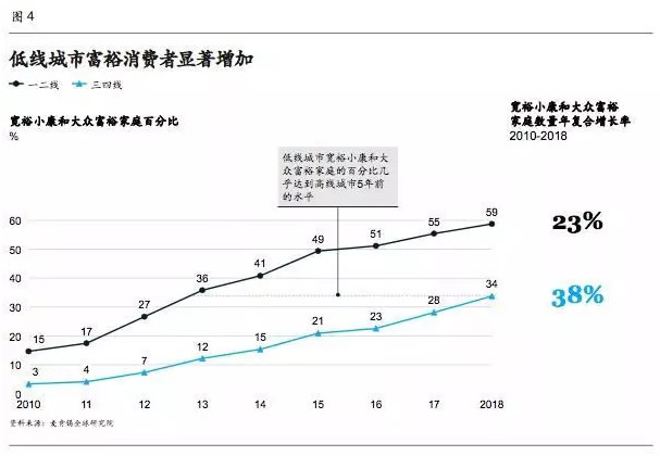 據(jù)麥肯錫《2020年中國(guó)消費(fèi)者調(diào)查報(bào)告》顯示,在三四線城市,中產(chǎn)階級(jí)消費(fèi)者數(shù)量快速增長(zhǎng)。2010年至2018年,三四線城市中,年可支配收入達(dá)到14萬(wàn)至30萬(wàn)元人民幣的家庭年復(fù)合增長(zhǎng)率達(dá)到38%,高于一二線城市的23%,這些較富裕家庭占到三四線城市人口的34%以上。這一群體并不擔(dān)心生活成本或未來(lái)儲(chǔ)蓄問(wèn)題,具有很強(qiáng)的購(gòu)買意愿,這些中低線城市“年輕購(gòu)物達(dá)人”對(duì)于中國(guó)消費(fèi)支出的持續(xù)大幅增長(zhǎng)功不可沒(méi)??梢?jiàn),崛起的新低線市場(chǎng)風(fēng)光無(wú)限,這里有太多的生意可以做。