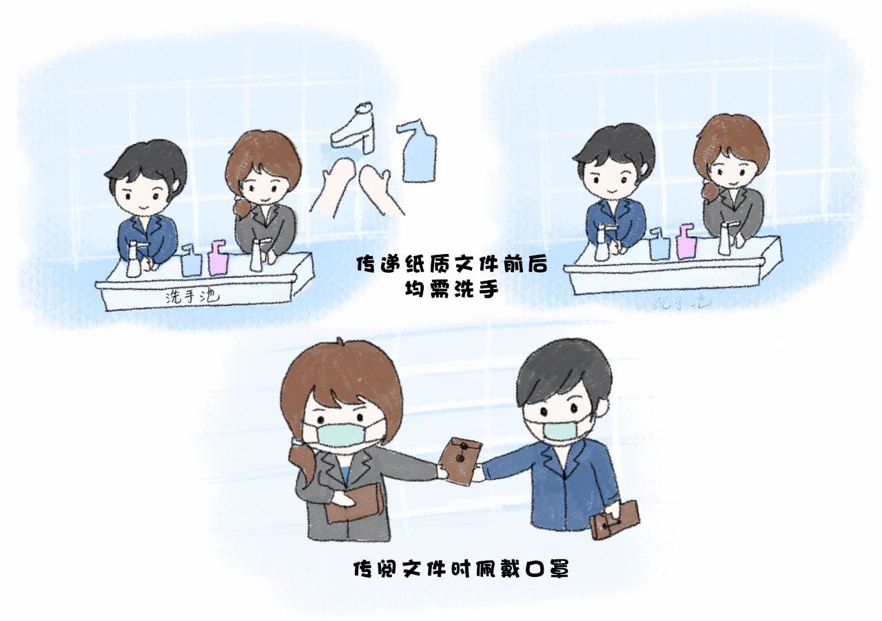 傳遞紙質(zhì)文件前后均需洗手,傳閱文件時(shí)佩戴口罩。