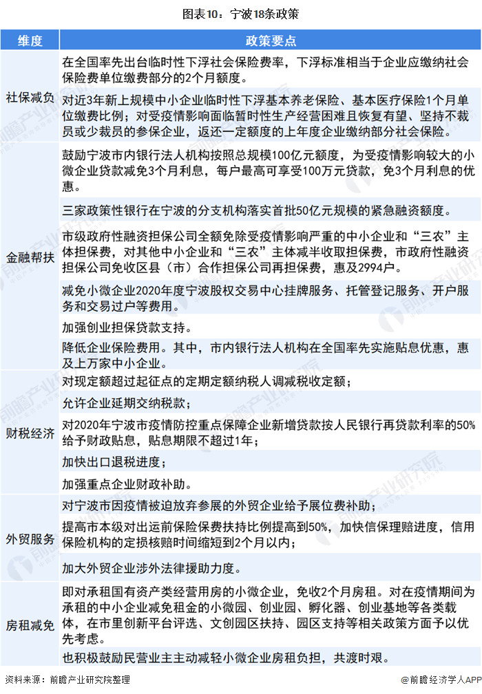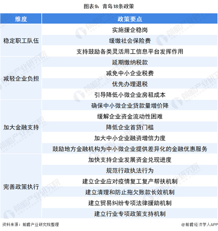 通過匯總和比較各地區(qū)出臺政策的維度和要點(diǎn),大多都集中在四個(gè)方面:加大金融支持、穩(wěn)定職工隊(duì)伍、減輕企業(yè)負(fù)擔(dān)、完善政策執(zhí)行、外貿(mào)服務(wù)、防護(hù)物資供應(yīng)等方面,都是解決企業(yè)在疫情發(fā)展情況下的燃眉之急,直擊企業(yè)運(yùn)營難點(diǎn)。