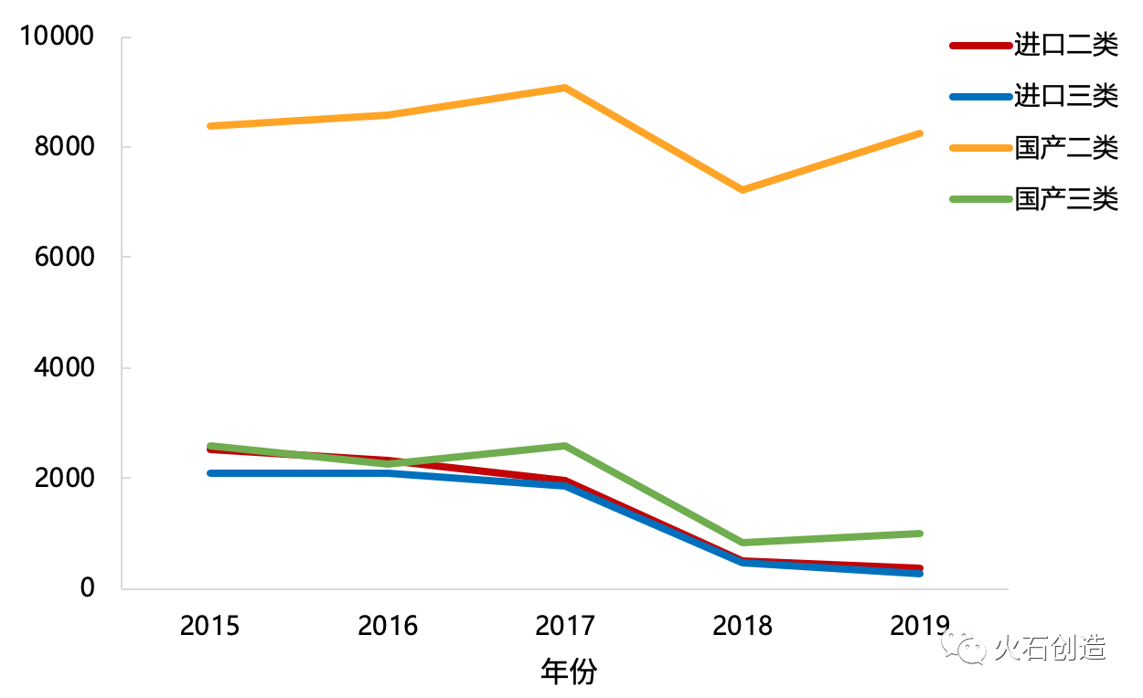 表1 2015—2019年二類器械國產(chǎn)與進(jìn)口獲批總數(shù)對比