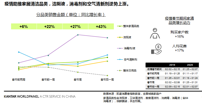 凱度消費者指數(shù)的最新報告顯示,在農歷新年以及疫情的雙重影響下,家居清潔品類銷售金額逆勢上揚。這主要是得益于滲透率和戶均購買量的提升,尤其是潔廁劑,消毒液和空氣清新劑,都有較明顯的漲幅。