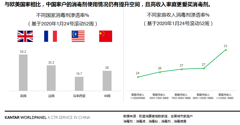 凱度消費者指數(shù)的全球數(shù)據(jù)分析也表明,中國消費者在過去一年只有28%的家庭購買過消毒液,遠低于歐美等國家的滲透率水平。此次新冠肺炎疫情暴發(fā),給社會生產生活造成了巨大的影響,但也是一次提高全民健康衛(wèi)生意識的集體公開課。