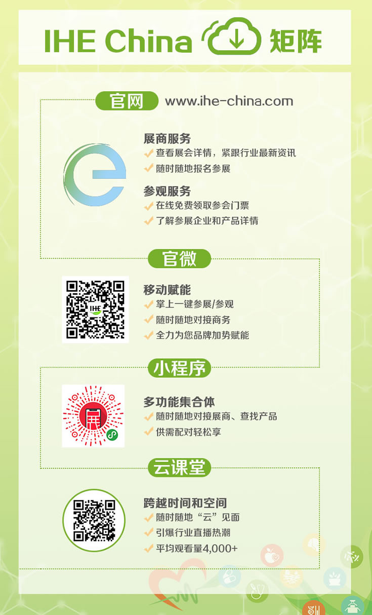 總的來看,隨著新冠肺炎疫情防控成效不斷顯現(xiàn),全市生產(chǎn)生活加快有序恢復(fù),人們的健康素養(yǎng)和衛(wèi)生意識大大提高,互聯(lián)網(wǎng)和大健康相關(guān)服務(wù)業(yè)表現(xiàn)出較強抗風(fēng)險能力和發(fā)展能力。鑒于此,IHE China廣州國際大健康展主辦方特別推出“IHE China云矩陣”,幫助中國品牌商和廠家,開拓國內(nèi)外市場,增加品牌知名度、提高品牌競爭力。推動在應(yīng)對疫情中逆勢增長的新產(chǎn)品、新業(yè)態(tài)、新商業(yè)模式加快產(chǎn)業(yè)布局,培育壯大新的增長點,努力實現(xiàn)全市經(jīng)濟(jì)平穩(wěn)運行。