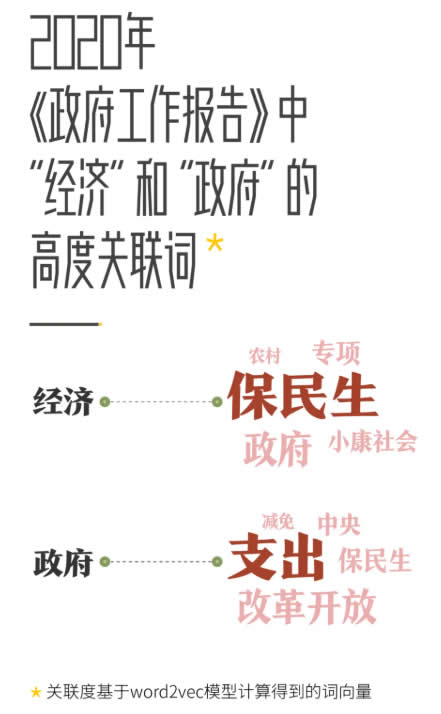 基于詞向量計(jì)算詞與詞之間的關(guān)聯(lián)度,我們得到“保民生”是“經(jīng)濟(jì)”的高度關(guān)聯(lián)詞,“支出”是“政府”的高度關(guān)聯(lián)詞,關(guān)聯(lián)度分別為0.999952912和0.999957323。