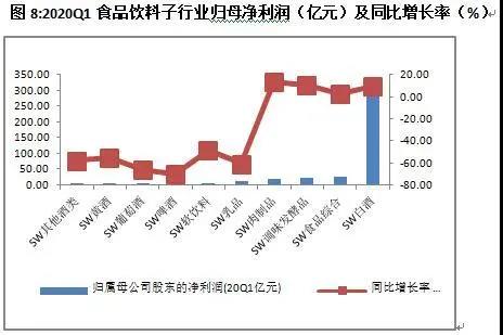 2020年第一季度受疫情影響,食品飲料行業(yè)實現(xiàn)營業(yè)收入合計1917.9億元,同比增長0.2%。實現(xiàn)歸母凈利潤合計390.7億元,同比微降0.66%。