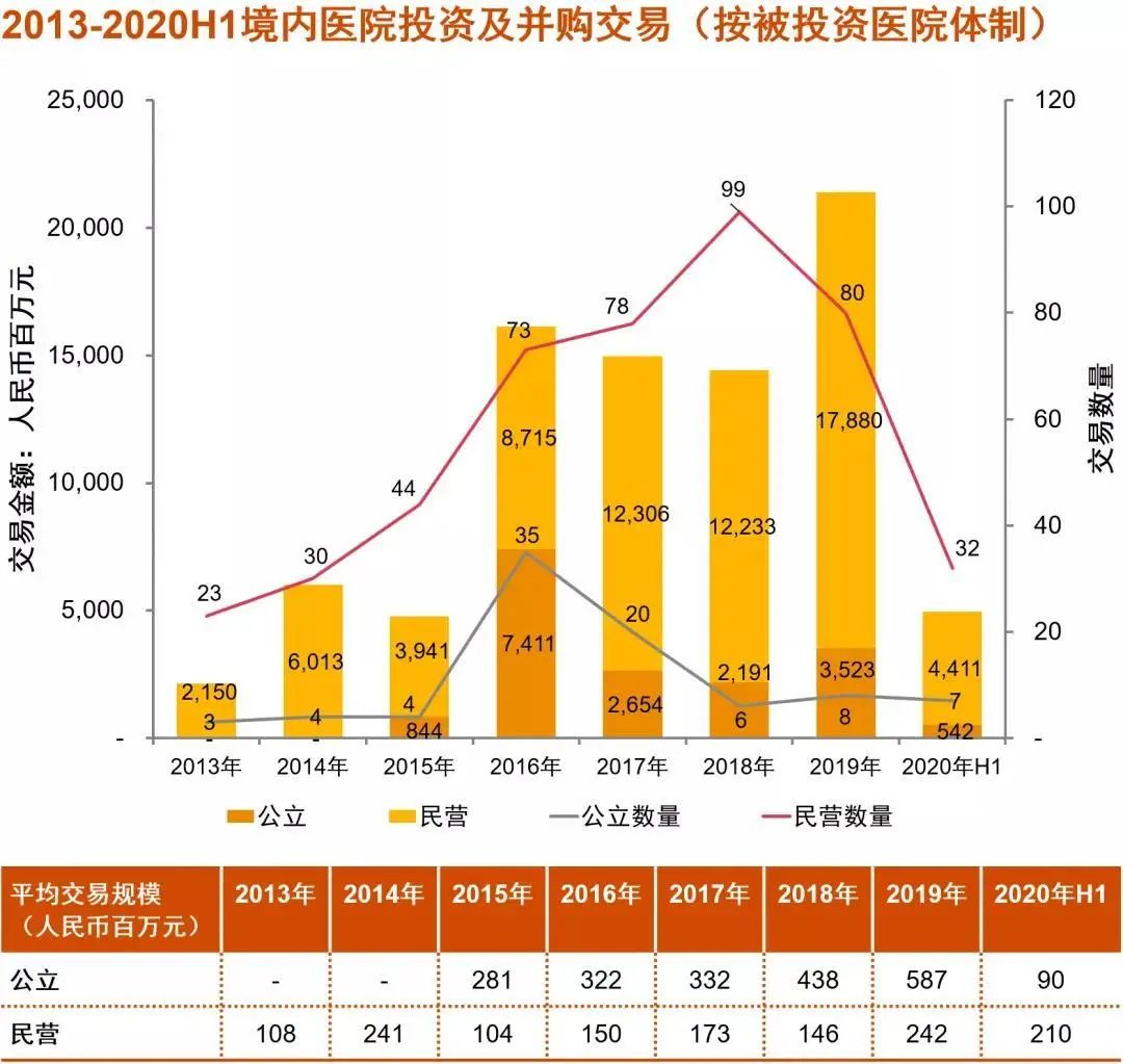 經(jīng)歷2019年體檢和互聯(lián)網(wǎng)醫(yī)療賽道的異軍突起,2020年上半年資本更加聚焦于傳統(tǒng)醫(yī)院板塊。在三博腦科、美中嘉和、賽德陽光等融資并購(gòu)事件帶動(dòng)下,已披露的醫(yī)院并購(gòu)交易規(guī)模達(dá)49.5億人民幣,占據(jù)上半年醫(yī)療健康服務(wù)板塊投資規(guī)模的半壁江山。