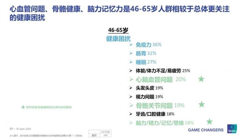 36-45歲的群體將健康的關(guān)注度放在腸胃(41%)、頭發(fā)健康(31%)和體重/肥胖(28%)等問題。隨著年齡的增長,心血管問題、骨骼健康、腦力記憶力是46-65歲人群相較于總體更關(guān)注的健康問題。