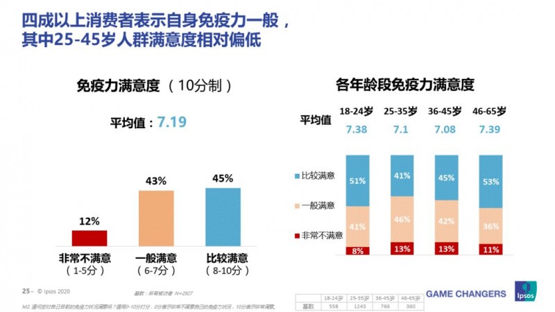 人們經(jīng)常把免疫力低下與體弱多病聯(lián)系在一起。四成以上消費者表示自身免疫力一般,25-45歲人群對自己免疫力的滿意度偏低。消費者的免疫問題主要體現(xiàn)在體力/精力不足(47%)、天氣變化時容易感冒(35%)和身體恢復(fù)慢(30%)等癥狀。