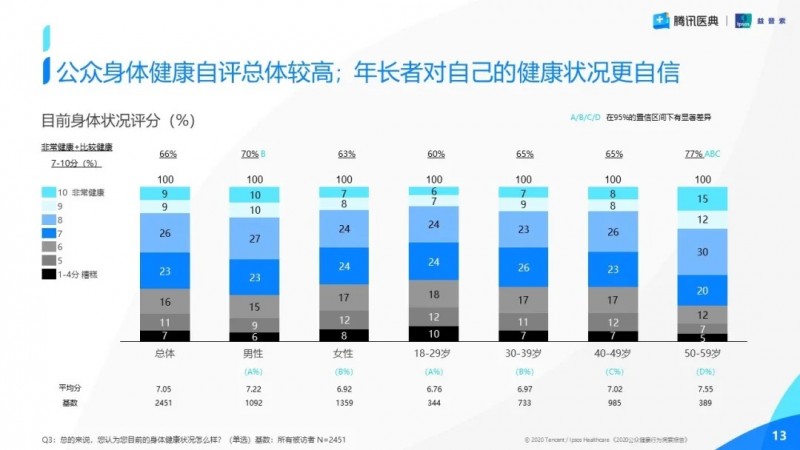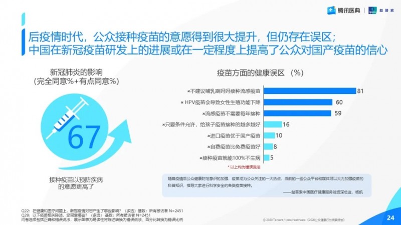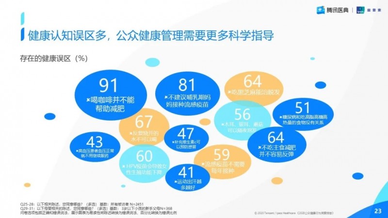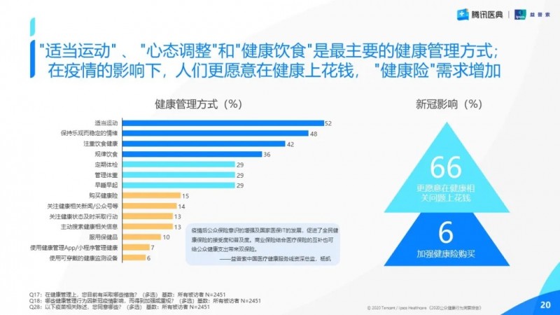 2020年11月8日,以“痛點“為主題的第二屆騰訊醫(yī)學(xué)ME大會登場。騰訊醫(yī)典聯(lián)合益普索Ipsos,在會議當(dāng)天發(fā)布了《2020公眾健康行為洞察報告》。本次研究通過對全國各地覆蓋18-59歲的2451名受訪者進行在線問卷調(diào)查,對后疫情時代公眾健康意識,健康狀況,健康管理行為,健康痛點和誤區(qū)等方面進行了全方位探索和分析。