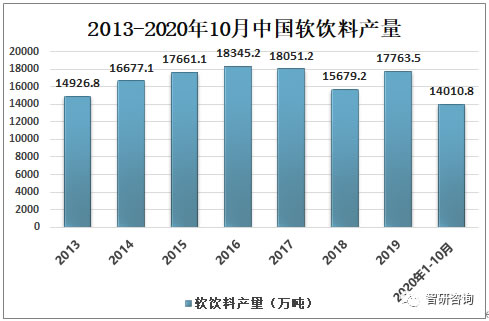 2019年中國軟飲料產(chǎn)量為17763.5萬噸,較2018年的15679.2萬噸同比增長13.29%;2020年1-10月中國軟飲料產(chǎn)量為14010.8萬噸。